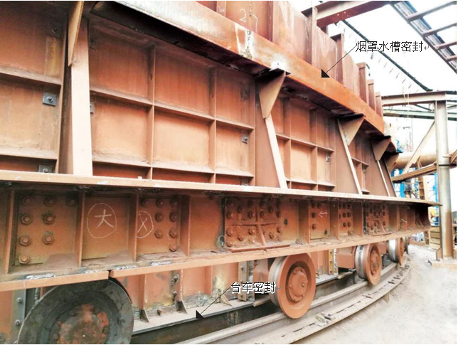 密封采用彈性可自調(diào)結(jié)構(gòu)。可根據(jù)環(huán)冷臺車跑偏情況進行彈性調(diào)整。對環(huán)冷機底梁、臺車輪、三角梁、煙罩等位置進行有效密封。煙罩部分采用水槽式密封結(jié)構(gòu),保證煙罩圈梁始終在水槽密封內(nèi)運行。密封后有效改善現(xiàn)場噴料、漏風(fēng)。改善現(xiàn)場環(huán)境,提高煙氣溫度,從而增加了發(fā)電量。